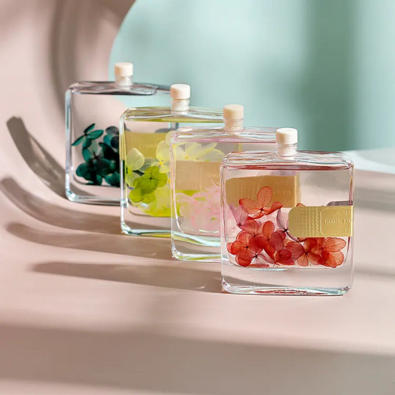 - Elegant Design: Square glass bottle filled with a clear liquid and preserved flowers in various colors (green, brown, red).