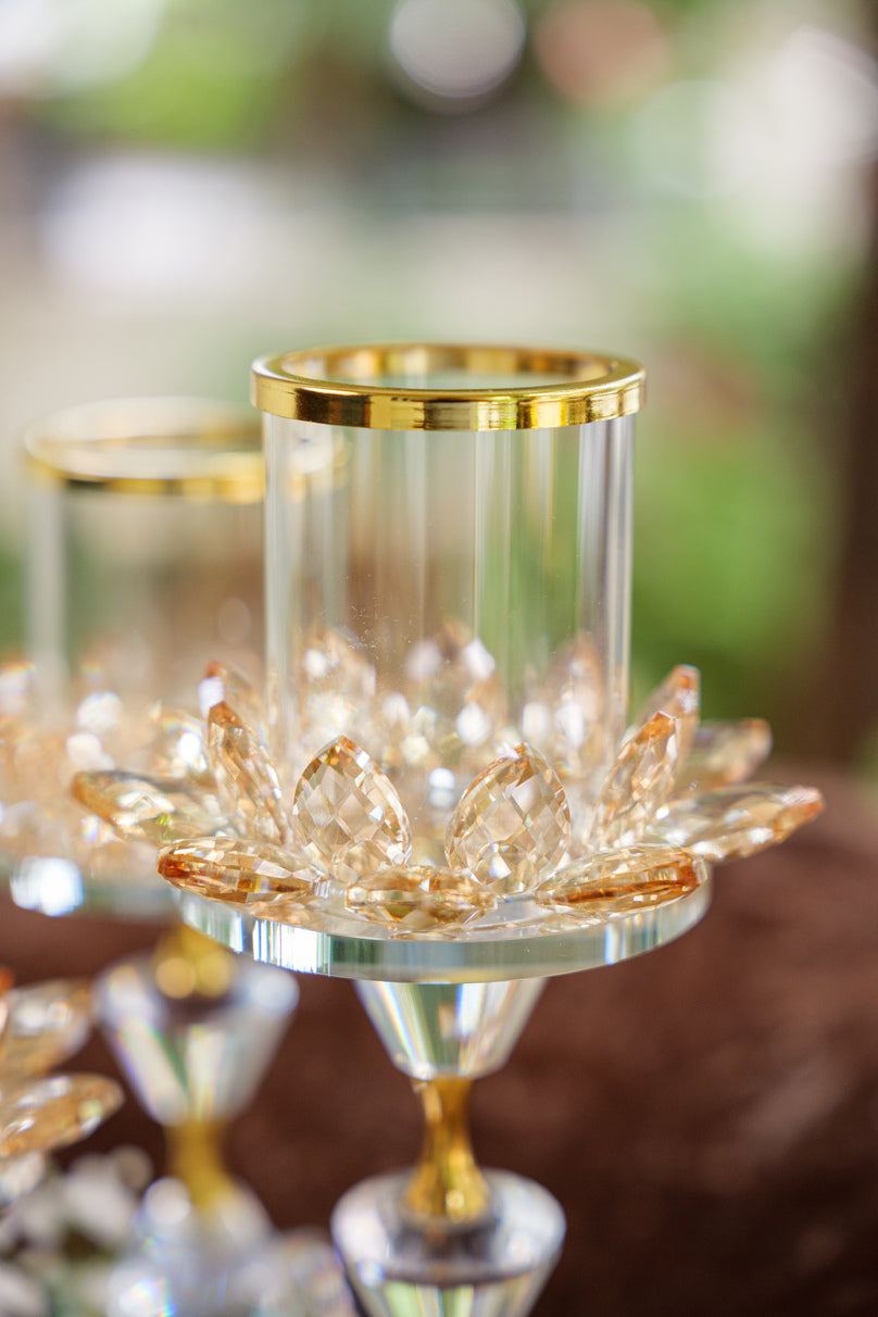 - Crystal Detailing: Pointed crystal accents around the base of the glass cylinder create a regal and radiant appearance.