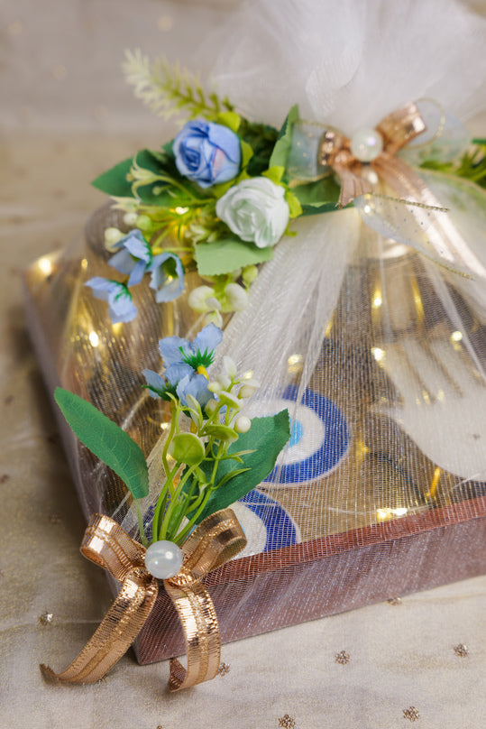 - Net & Floral Decoration – Adorned with white net wrapping, blue floral accents, and pearl-ribbon detailing for a sophisticated finish.