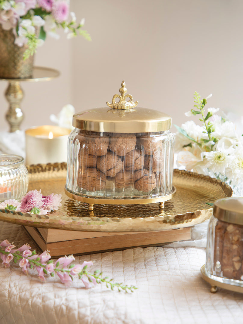 - Elegant Design: Features a clear fluted glass body with a smooth brass lid and a matching brass base with tiny ornate legs.