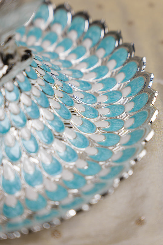 - Feather-Inspired Design – The circular base is artistically patterned with layered feather-like motifs, giving a textured and regal look.