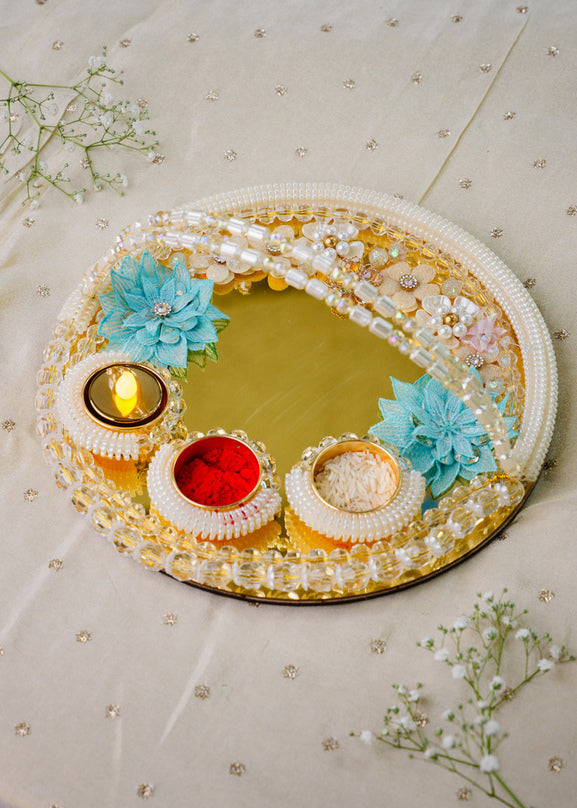 Golden Basket Pooja Thali | Acrylic Mirror Floral Festive Set