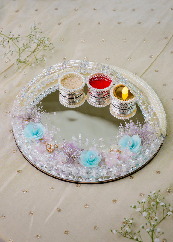 Crystal-Inspired Design: Round pooja thali with mirror base and bordered in elegant pearl and crystal beading.